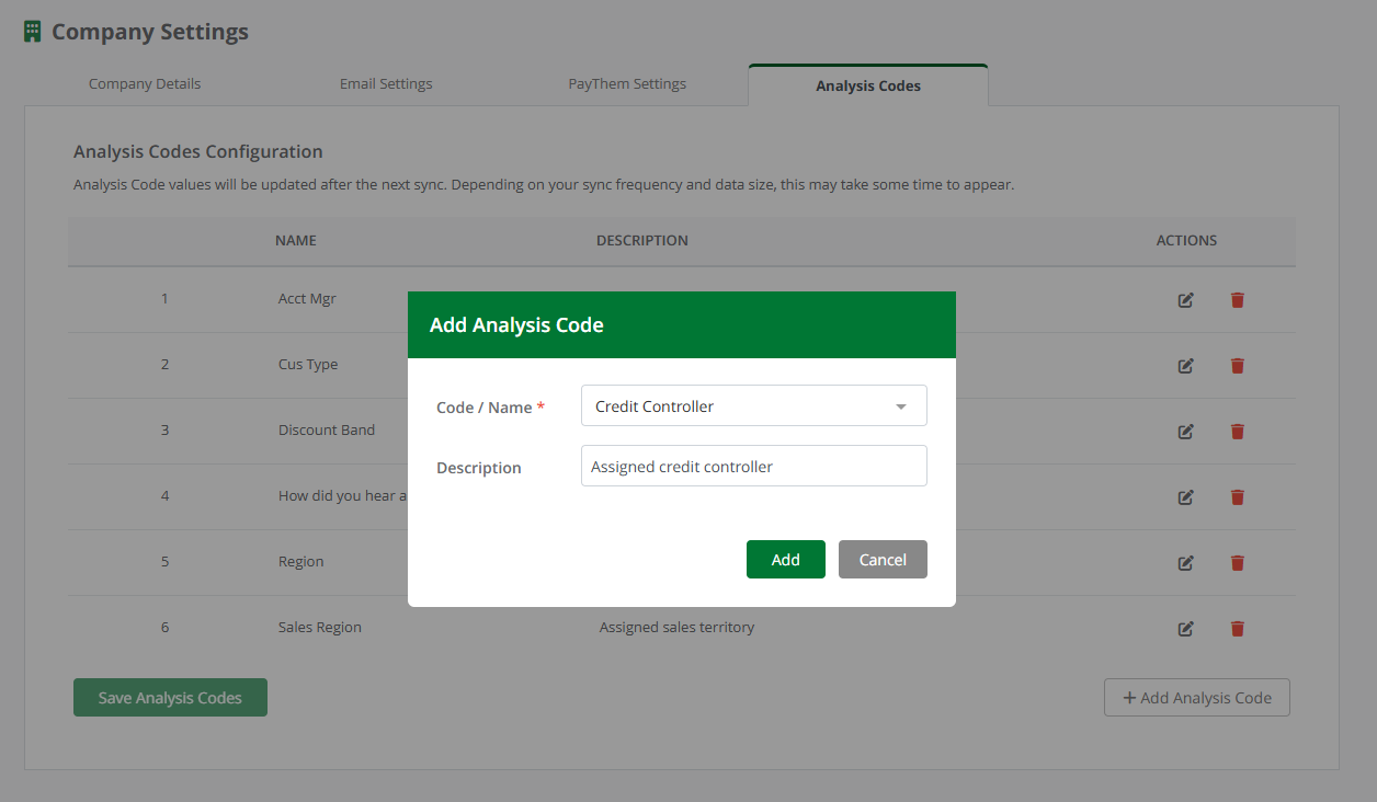 This area allows you to configure Analysis Codes and synchronise analysis code values into Credit Hound Cloud.