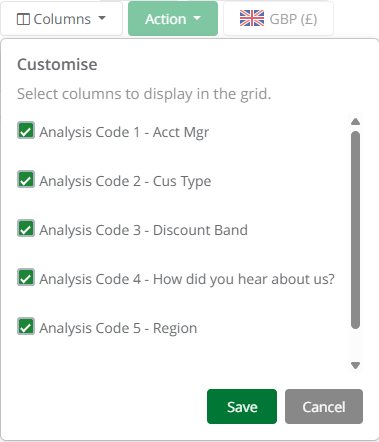 Analysis Codes appear in the Customer List and Aged Debt List and can be used to enhance filtering, segmentation, and customer management. Use the Columns button to add the configured Analysis Code columns to the lists.